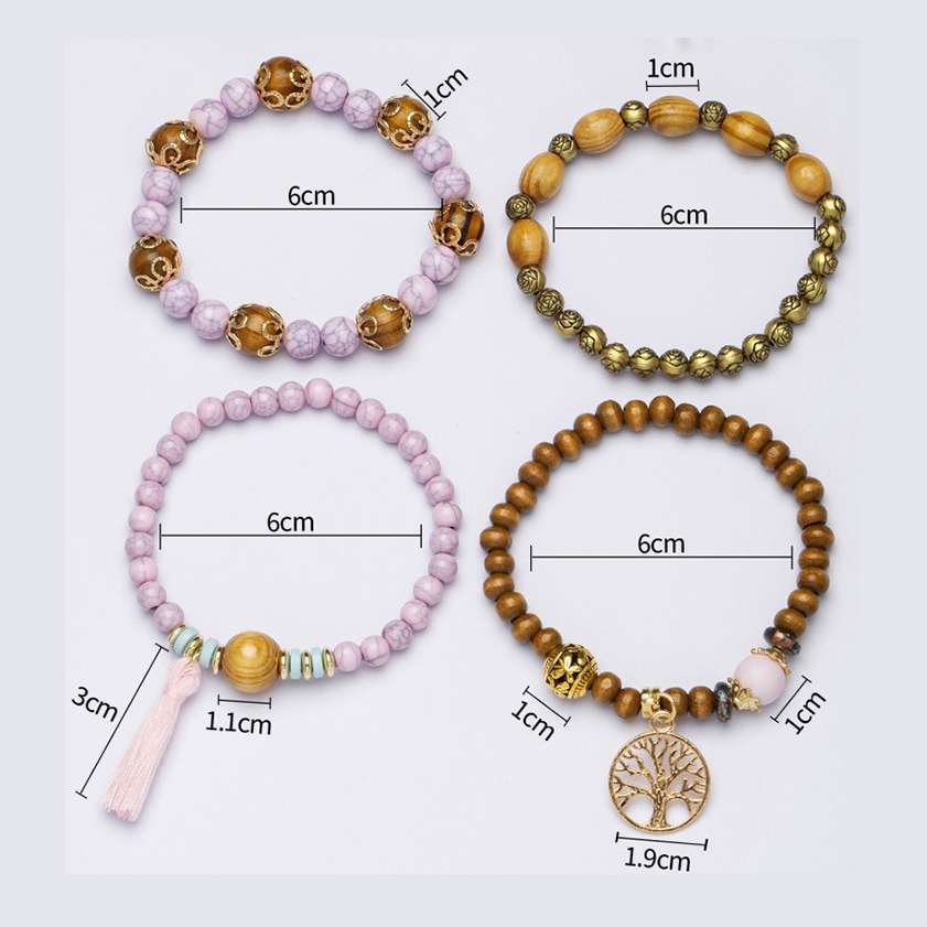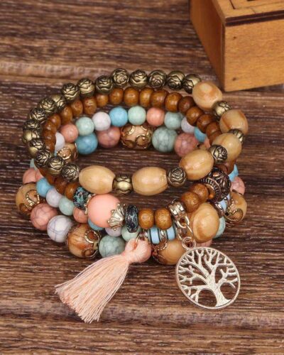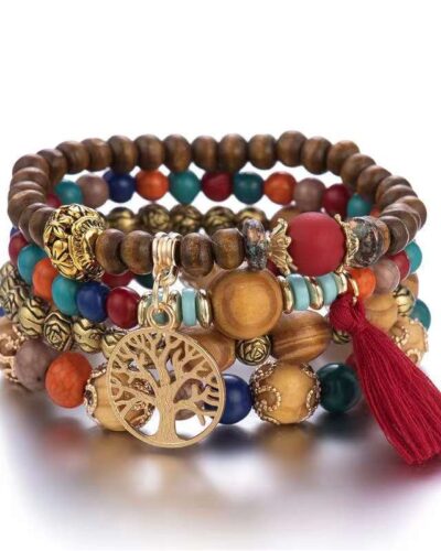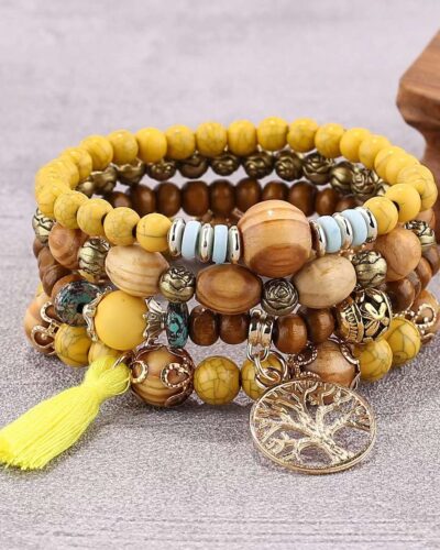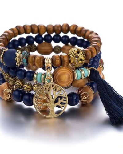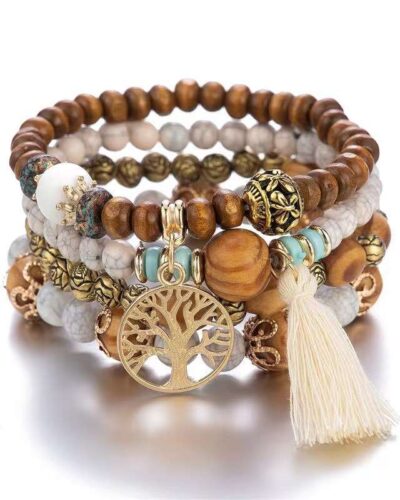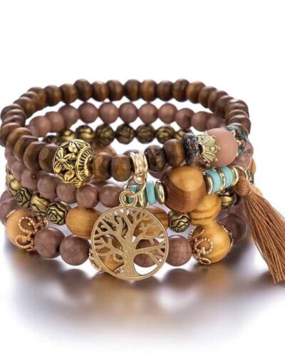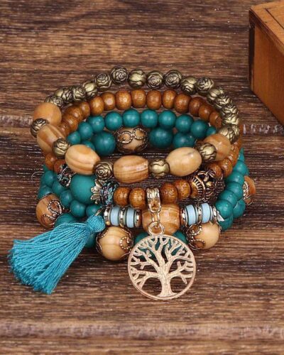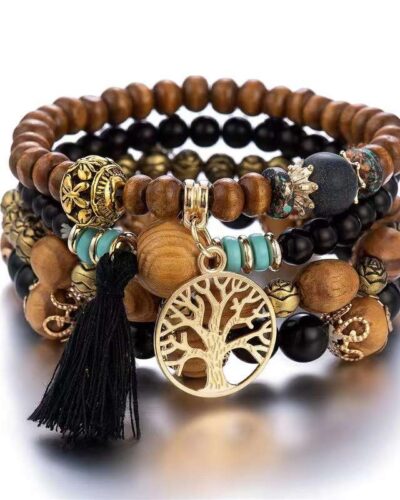 The Bohemian Stackable Bracelet set is crafted from high-quality alloy and wood, featuring tassels and a tree of life pendant. Add a touch of youthful energy to your everyday outfits.