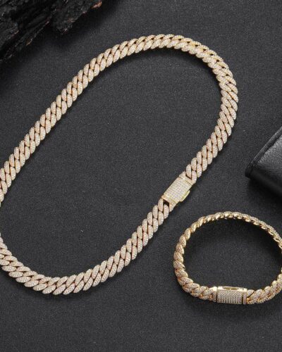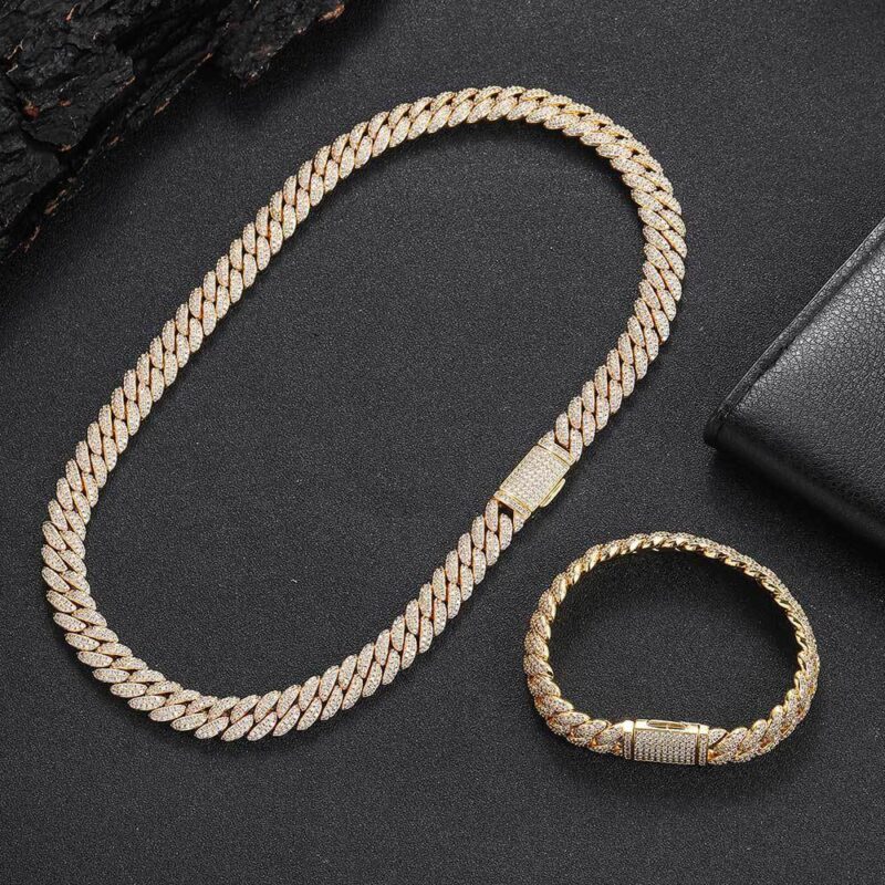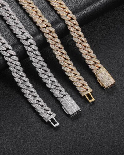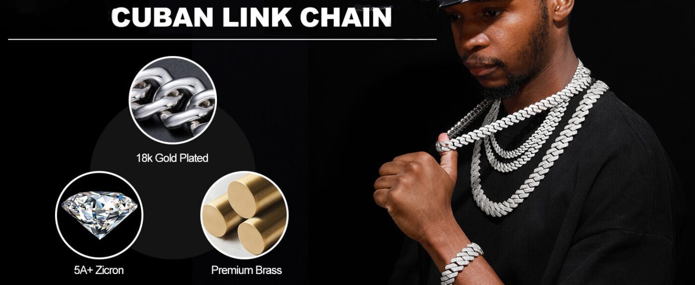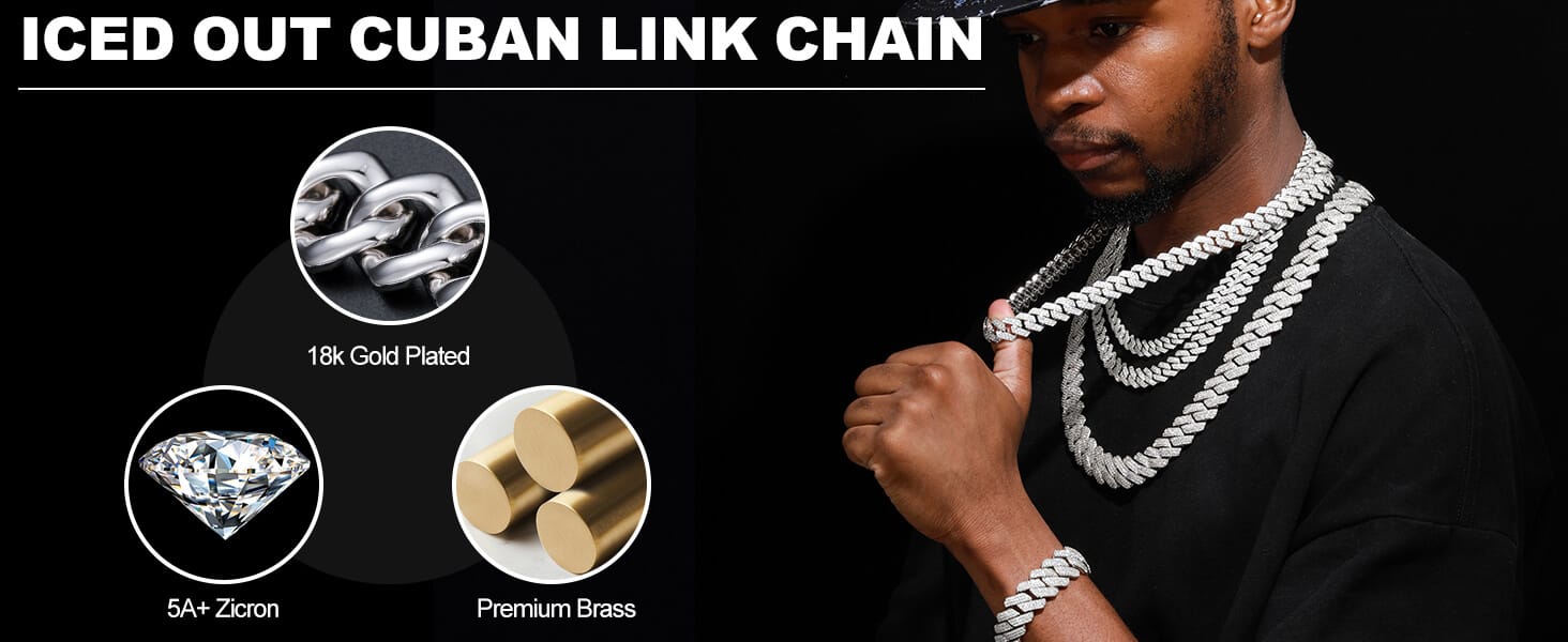 - Luxury Diamond Miami Cuban Link Chain is plated with 5-layered 18K gold on brass with 5A zirconia stones.