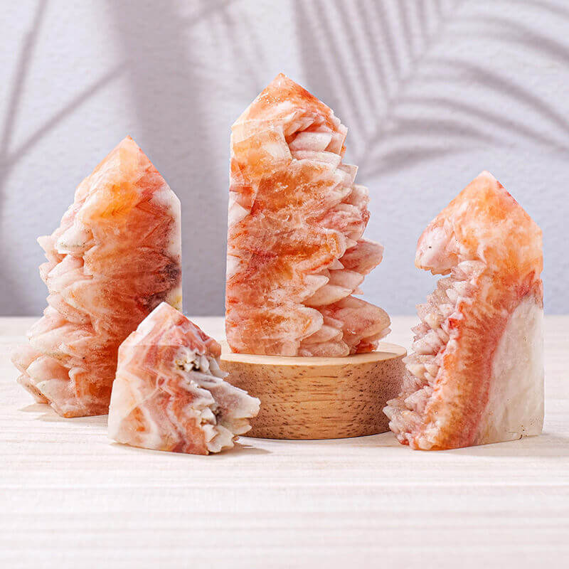 - This tower is made of naturally formed orange calcite geodes cluster. It has great healing energy and properties.
