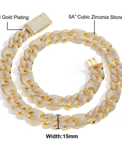 15mm Şişirilmiş Denizci 18K Altın Kaplama Kübik Zirkon Kübik Baklalı Zincir