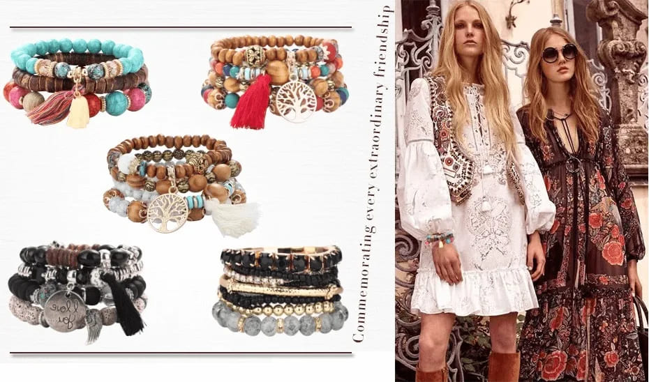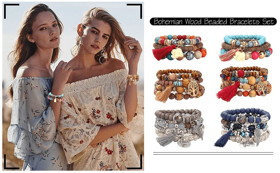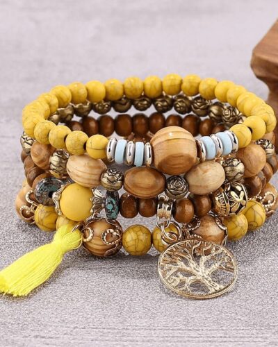 - These wooden beads are connected by an elastic band. This bohemian stackable bracelet set comes with a tree of life fashion elements composition.