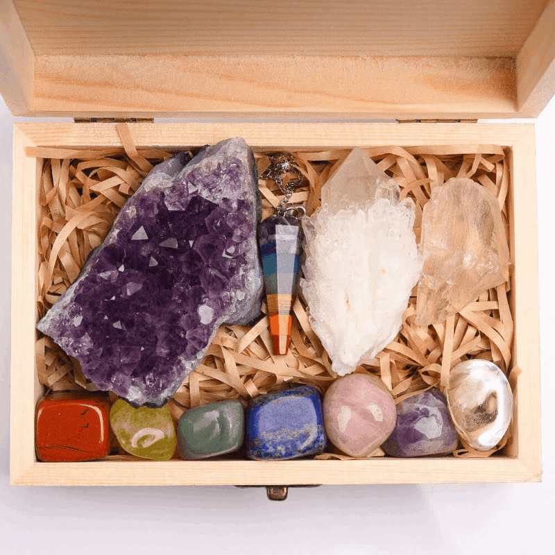 - Box including Amethyst Clusters(100g), White Crystal Clusters(50g), Rose Quartz Rough(30g), Chakra Pendulum, and 7 Chakra Crystal Stones(clear quartz, amethyst, sodalite, green aventurine, citrine, carnelian, and red jasper).