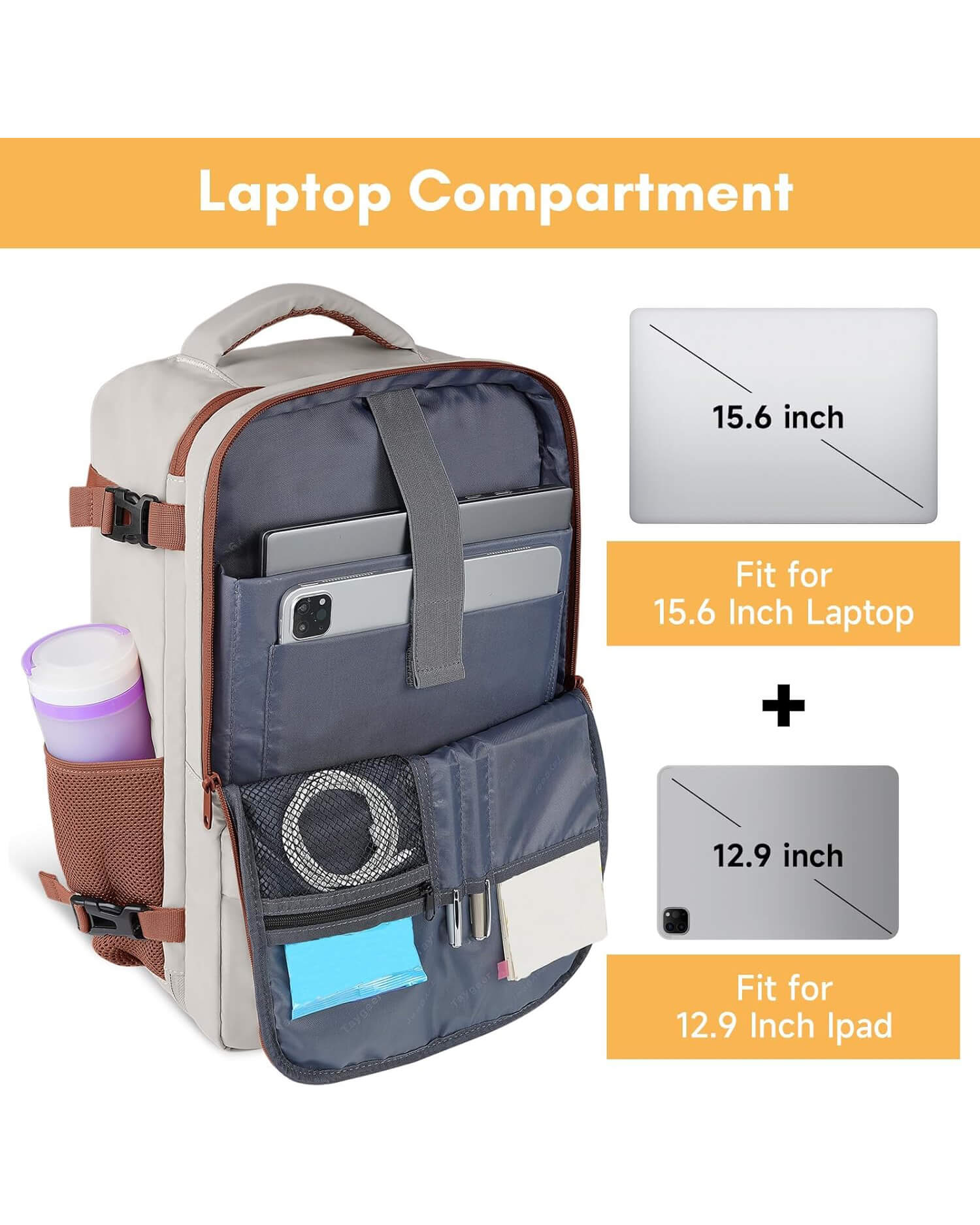 The padded laptop compartment fits a 15.6-inch laptop and a 12.9-inch iPad, while additional pockets accommodate travel essentials, textbooks, wallets, clothes, shoes, pens, and more—ideal for airplane travel or college life.