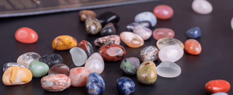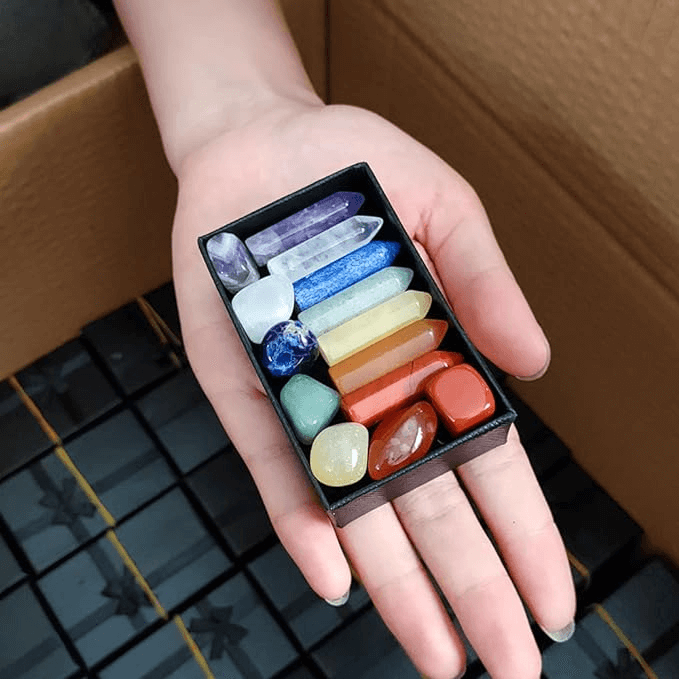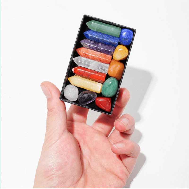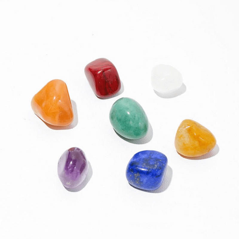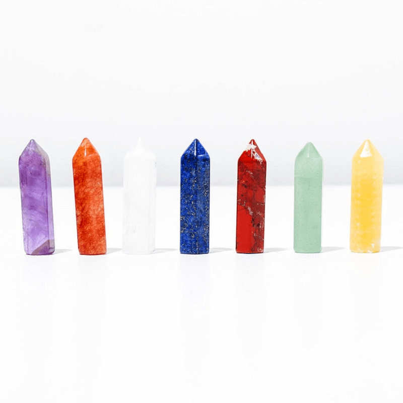 7 crystal towers & 7 tumbled stones, namely red jasper, green aventurine, lapis lazuli, clear quartz, sunstones, yellow agate, and amethyst.