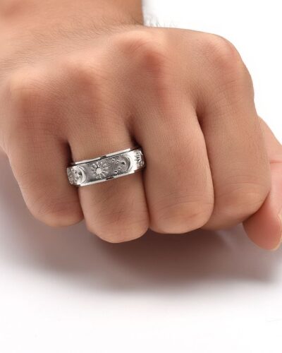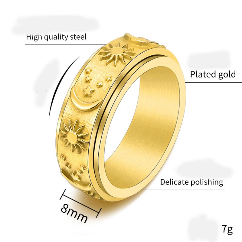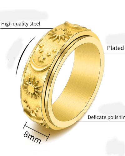 Womens Stainless Steel Ring with Moon and Star Engraved ✨. The surface is engraved with three-dimensional moon and stars, and the rotating design makes it more advanced. It is full of personality after wearing it.
